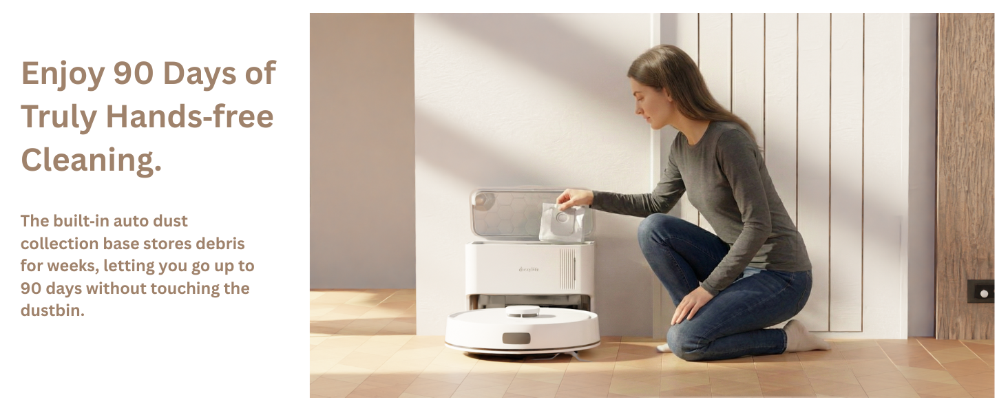 Go up to 90 days without manually emptying the dustbin.